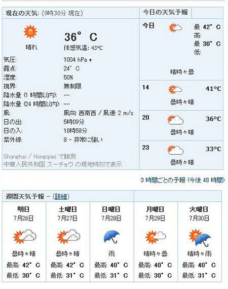 MSN Japanの蘇州の今日の天気は、最高気温42度、最低気温30度とか....