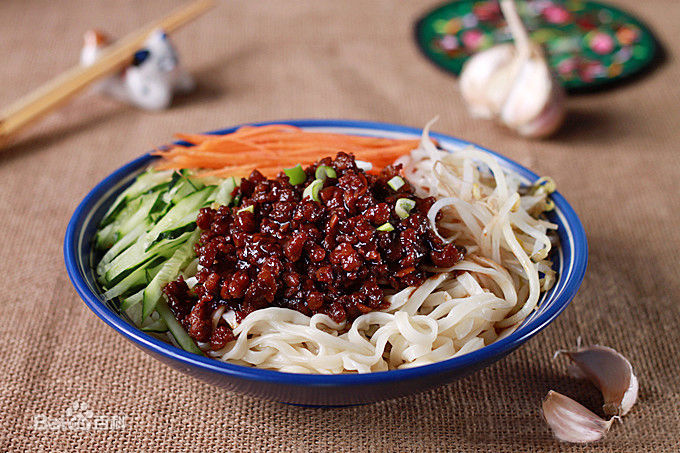 豚のひき肉を炒めて味噌の味付けをしたものを麺にかけるのが炸醤麺です。