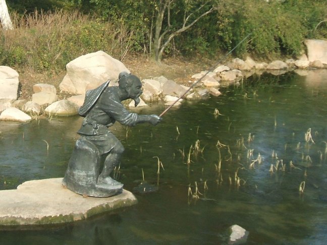 水墨画にでも出てきそうな釣をするおじいさんの像があって、